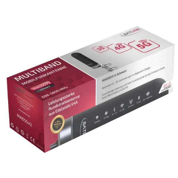Die beiden MAO5GV1 Antennen, die im MDDV1-SET enthalten sind, decken alle wichtigen Mobilfunkfrequenzen ab, darunter 698-960 MHz, 1710-2700 MHz und 3400-5800 MHz. Dadurch können Sie sich auf eine hervorragende Leistung sowohl im 3G, 4G und LTE Bereich als auch bei 5G und Wi-Fi verlassen. Egal, ob Sie in einer ländlichen Umgebung mit schwachem Empfang arbeiten oder in einem städtischen Gebiet mit hoher Netzlast – diese Antennen gewährleisten immer eine starke und stabile Verbindung.