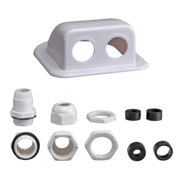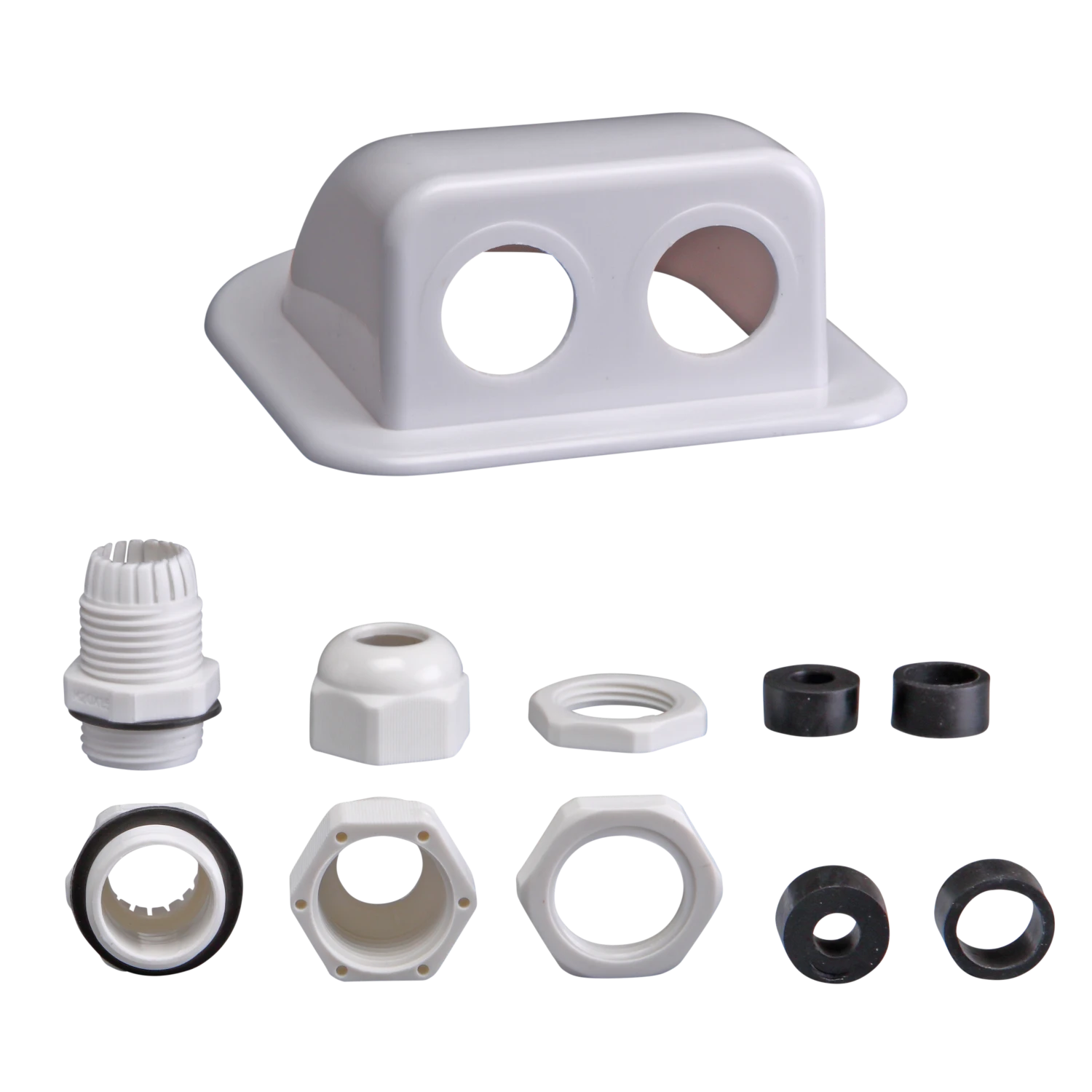 Wetterfeste 2-fach Kabeldurchführung zur sicheren Verlegung von Antennen-, Solar- oder Steuerkabeln (Ø 3–7 mm). UV-beständig, IP68-zertifiziert, für Verklebung vorgesehen. Ideal für Wohnmobil, Boot, Gartenhaus oder Industrie.