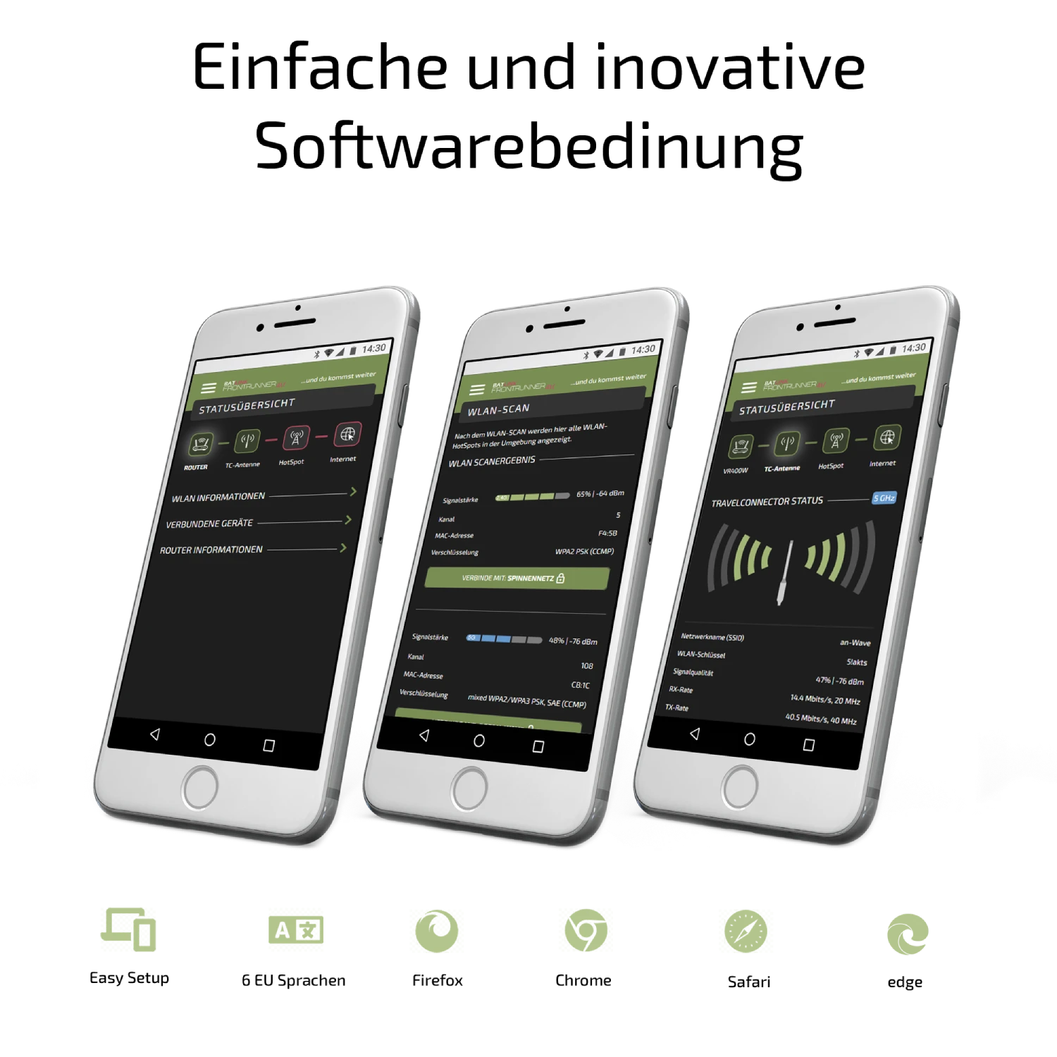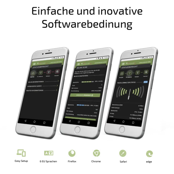 Die Bedienung ist dabei besonders einfach: Verbinde dich per WLAN mit dem Router und öffne die intuitive Weboberfläche in deinem Browser. Eine zusätzliche App oder Software musst du nicht installieren. Wähle einfach deine Sprache – Deutsch, Englisch, Spanisch, Französisch, Italienisch oder Portugiesisch – und scanne die Umgebung nach verfügbaren Hotspots. So kannst du schnell und unkompliziert die beste Verbindung aufbauen.