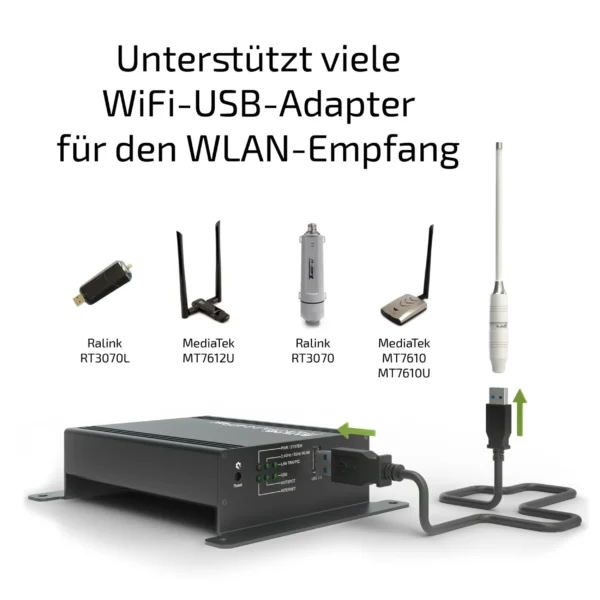 Das robuste Aluminiumgehäuse schützt die Technik zuverlässig vor Vibrationen und Stößen, sodass der Router auch im mobilen Dauereinsatz überzeugt. Durch die breite Spannungsversorgung von 11 bis 28 Volt lässt er sich einfach im Fahrzeug, Boot oder Caravan betreiben.