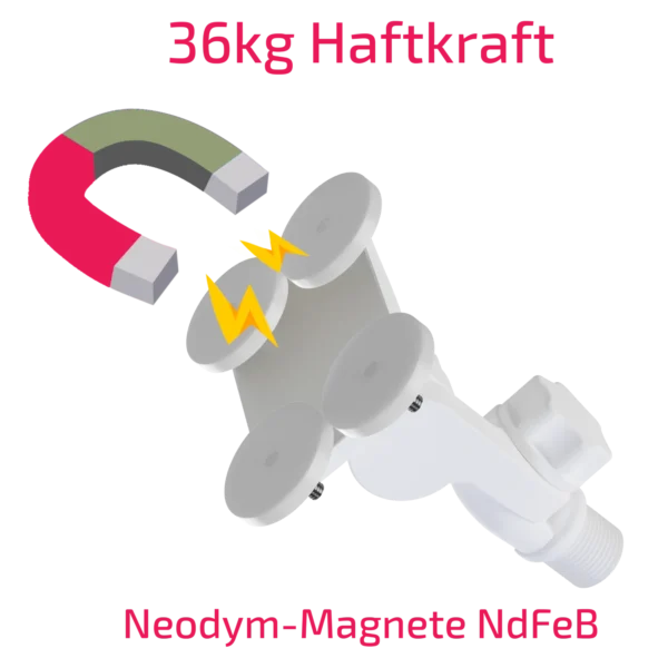 Wie der 3DK Kipphalter verfügt auch der 3DKM über zwei 180°-Gelenke für präzise Anpassungen. Der Gummimantel, der die Magneten umgibt, schützt vor Kratzern und erhöht die Rutschfestigkeit, während er gleichzeitig die Haftkraft der Magneten auf der Oberfläche verstärkt. Diese robuste Bauweise hält extremen Wetterbedingungen stand und sorgt für eine zuverlässige Befestigung.