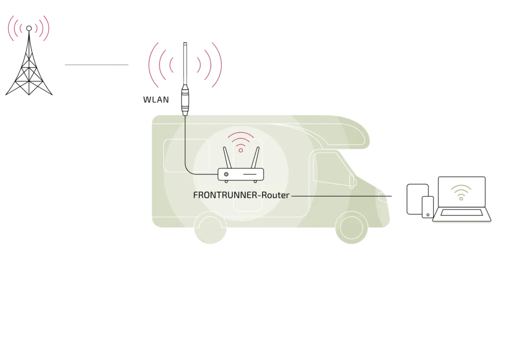 Der TravelConnector empfängt das WLAN Signal eines externen Hotspots wie z. B. vom Campingplatz, Hafen oder Hotel. Über das USB Kabel gelangst das Singal direkt an den Frontrunner-Router, der dann ein starkes lokales WLAN-Netz für deine Endgeräte erstellt.