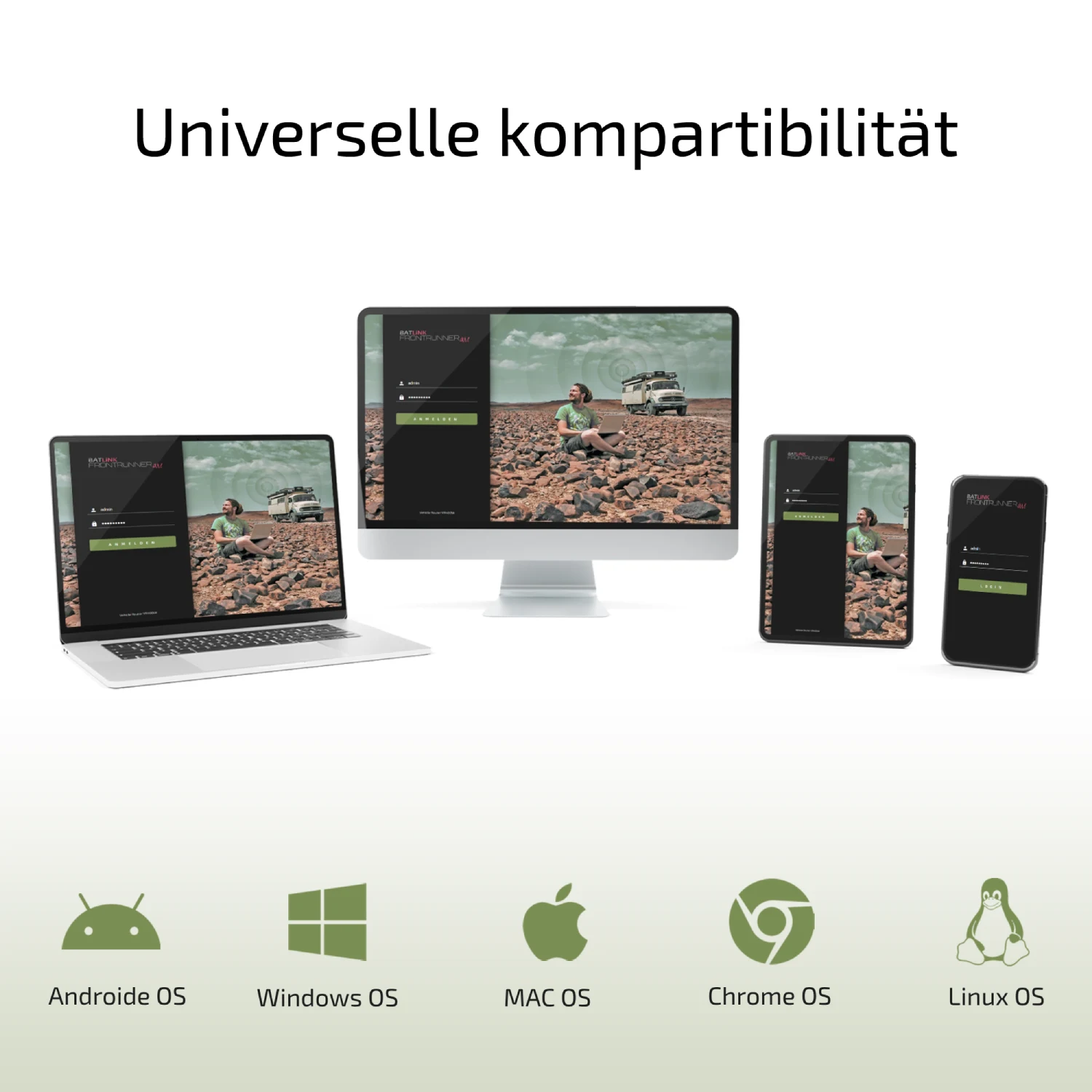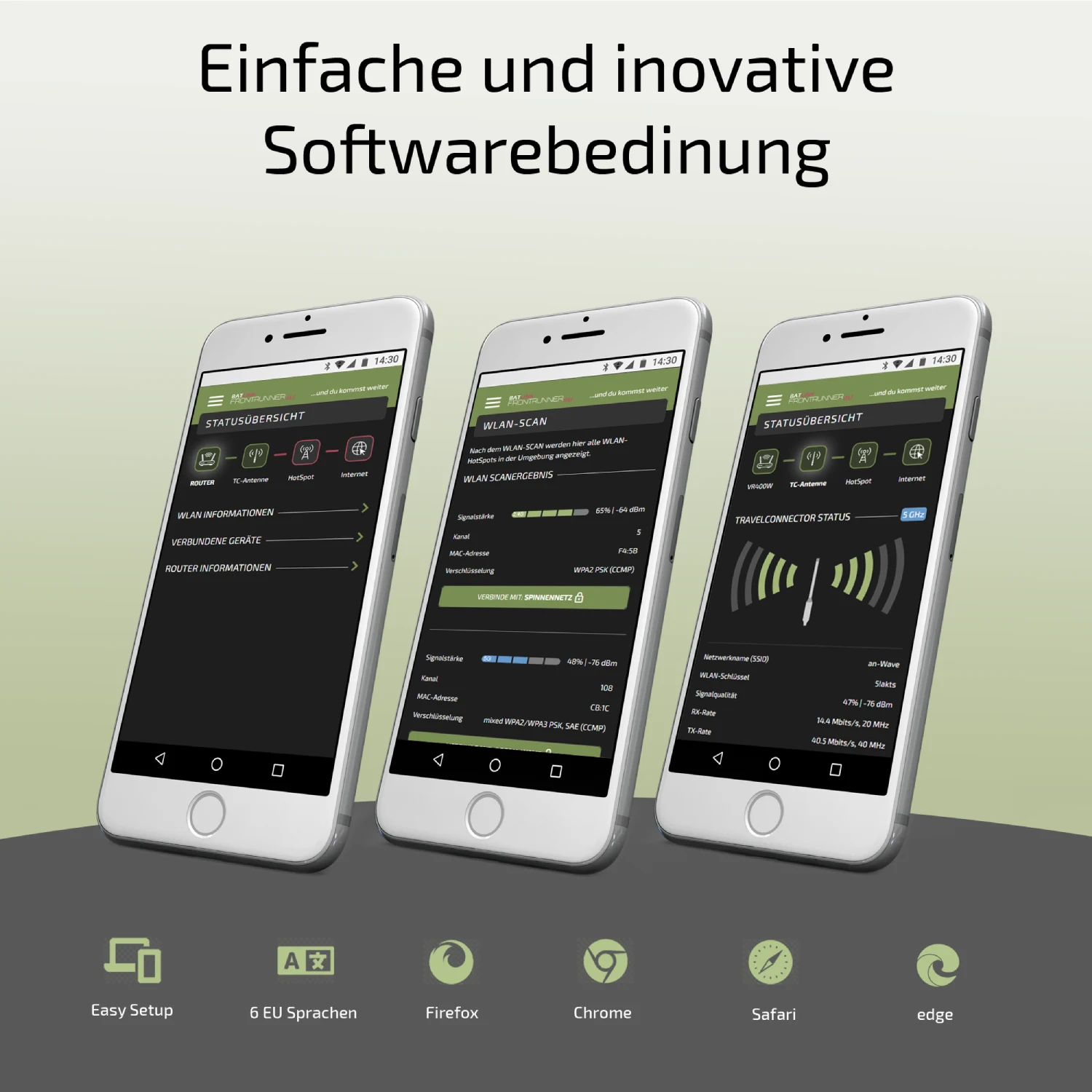 Die Softwarebedienung des Frontrunner Routers funktioniert mit jedem Webbrowser über ein Endgerät wie z. B. Notebook, Tablet oder Smartphone. Eine Softwareinstallation oder das Herunterladen einer App ist nicht erforderlich.