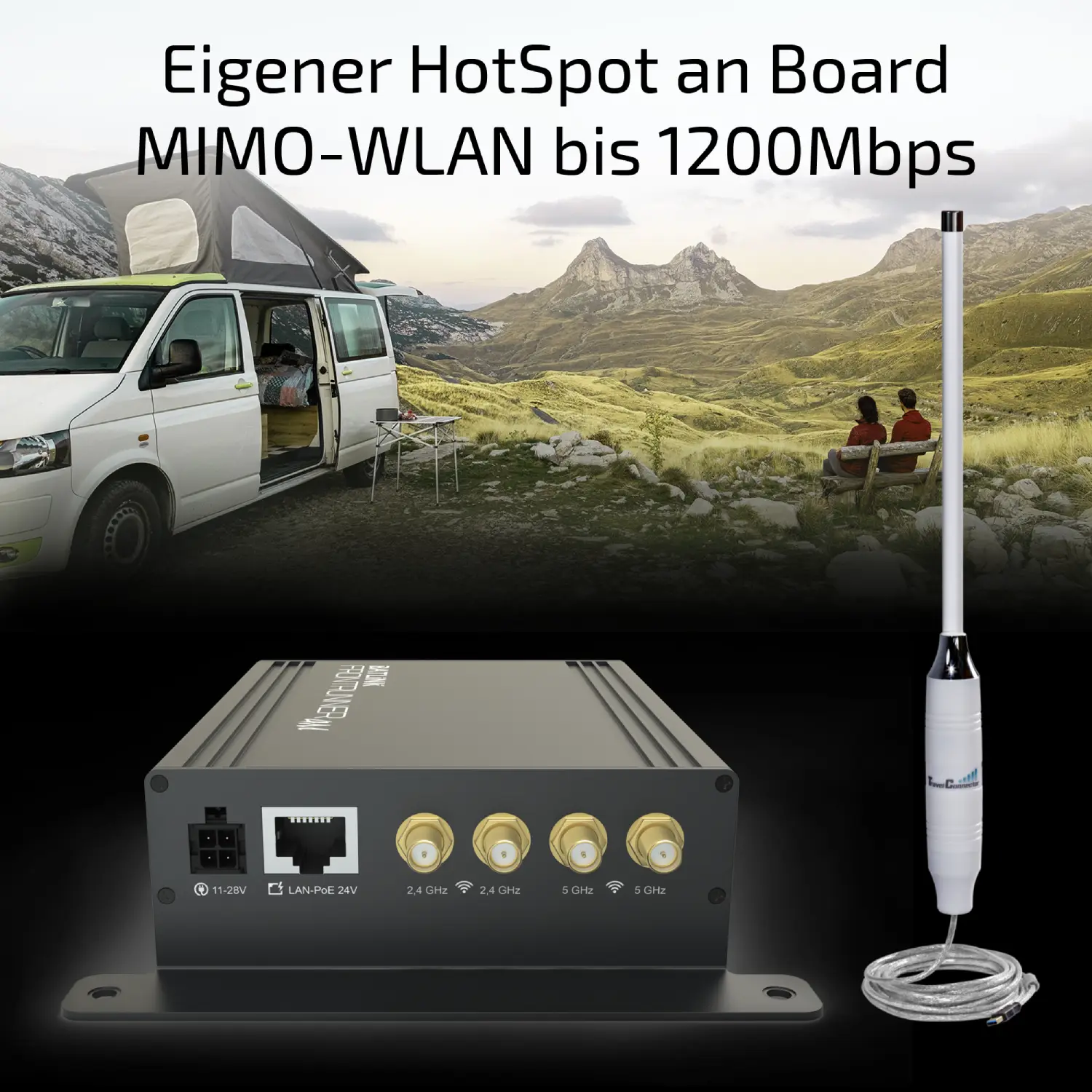 Leistungsstarkes WLAN Set mit 10 dBi Dualband Antenne für höchste Reichweite. Ideal für Wohnmobil, Boot oder Gartenhaus. Stabile Verbindung zu weit entfernten Hotspots – eigener WLAN Zugang für bis zu 20 Geräte.