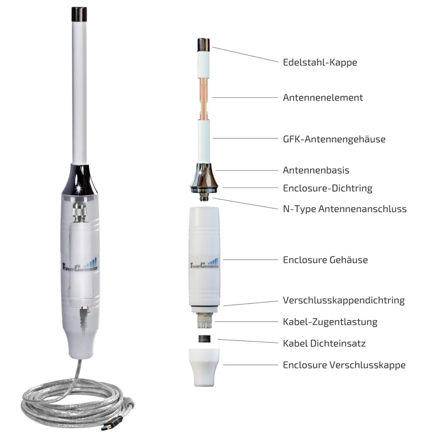 Das TravelConnector-Set TCS657 wurde für den zuverlässigen Außeneinsatz entwickelt. Die Antenne besteht aus rostfreiem Edelstahl (V4A) und wetterfestem, UV-beständigem Kunststoff. Diese Kombination macht sie besonders widerstandsfähig gegenüber Sonne, Regen, Wind und Temperaturschwankungen.