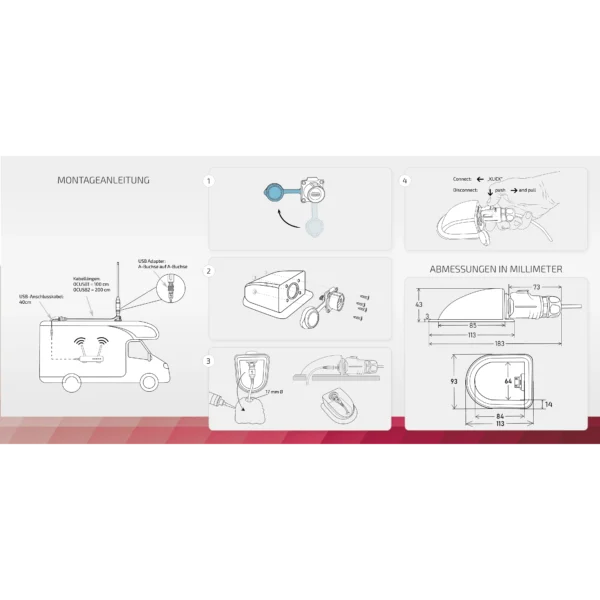 Die Montage erfolgt einfach per Klebe Befestigung (Kleber nicht im Lieferumfang). Die detaillierte Anleitung mit Zeichnungen zeigt die Schritte zur schnellen Installation – inklusive Durchmesserangabe für die Durchführung (17 mm Ø) und der korrekten Handhabung des Klick Systems.
