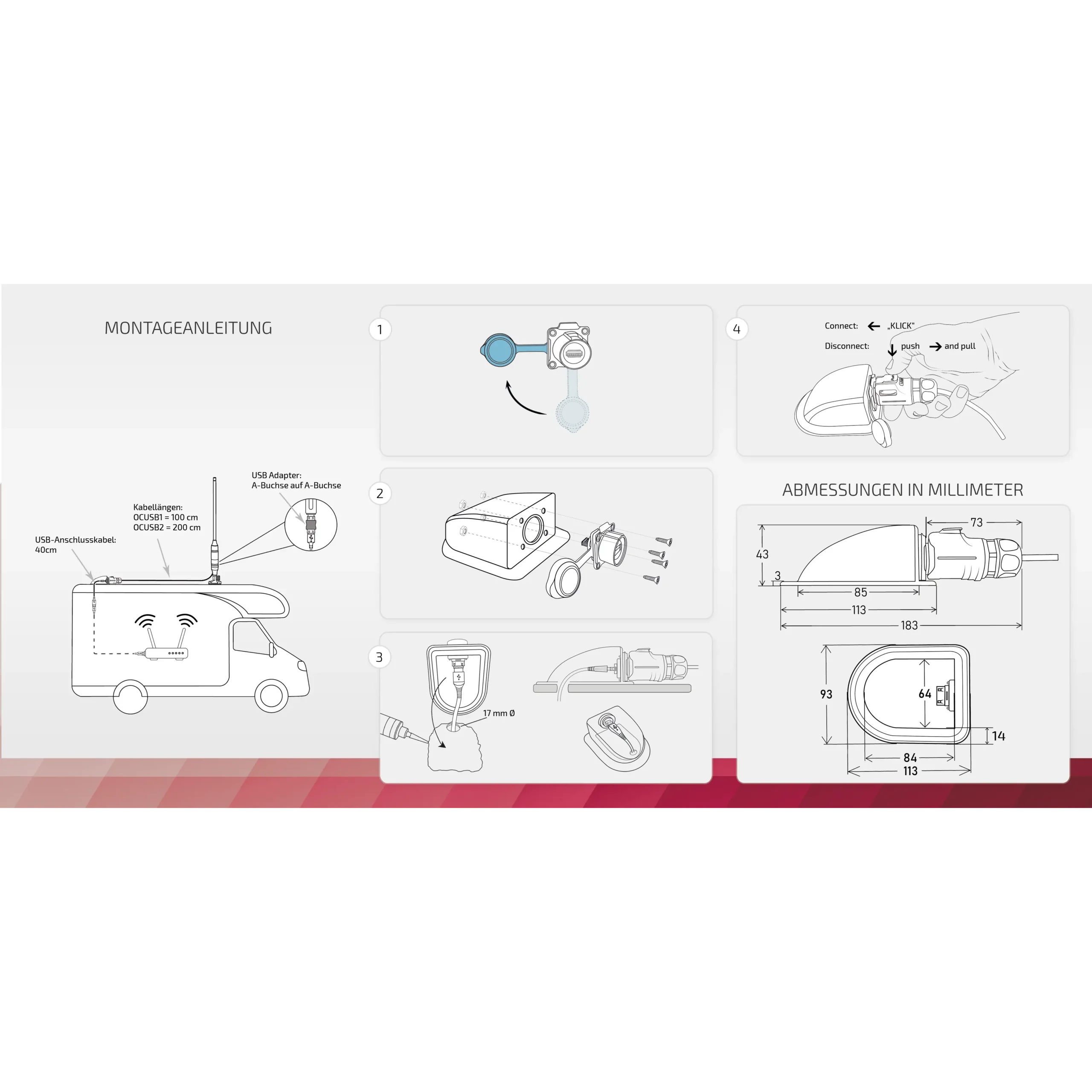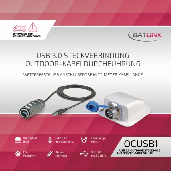 Die BATLINK OCUSB Kabeldurchführung ermöglicht eine zuverlässige und wetterfeste USB Verbindung am Fahrzeug, Camper, Caravan, Boot oder in industriellen Outdoor Umgebungen. Über die verklebbare Anschlussdose lässt sich ein USB Anschluss sicher nach außen führen – ideal für USB WLAN Antennen, Outdoor Sensorik oder andere USB 2.0 / 3.0 Geräte.