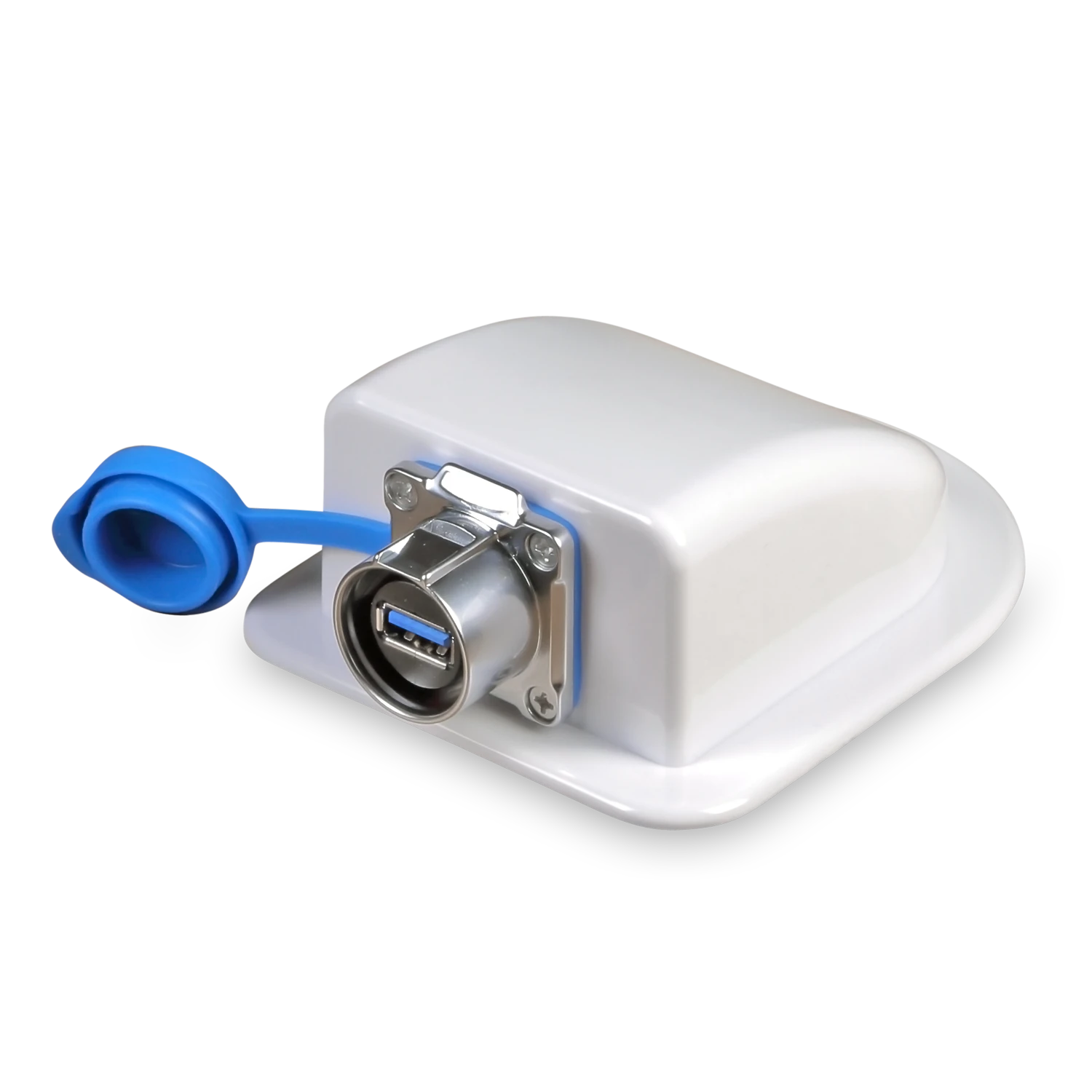 Wetterfeste USB 3.0 Kabeldurchführung mit Klick Verschluss und vergoldeten Kontakten. Ideal für Wohnmobil, Campingbus, Boot und Industrieanwendungen. Schnelle und stabile USB Verbindung bis 5 Gbit/s – perfekt für USB WLAN Antennen und Outdoor Geräte.