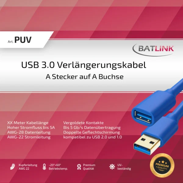 Hochwertige USB 3.0 Verlängerung mit vergoldeten Kontakten, AWG22 Kupferleiter für bis zu 5 A Strom, doppelter Schirmung und Superspeed-Datenübertragung bis 5 Gbit/s. Robustes, flexibles Kabel in edlem Blau – erhältlich in 1,5 m, 3 m oder 5 m Länge.