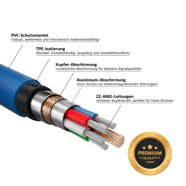 Leitermaterial: AWG28 (Daten), AWG22 (Strom) – reines Kupfer